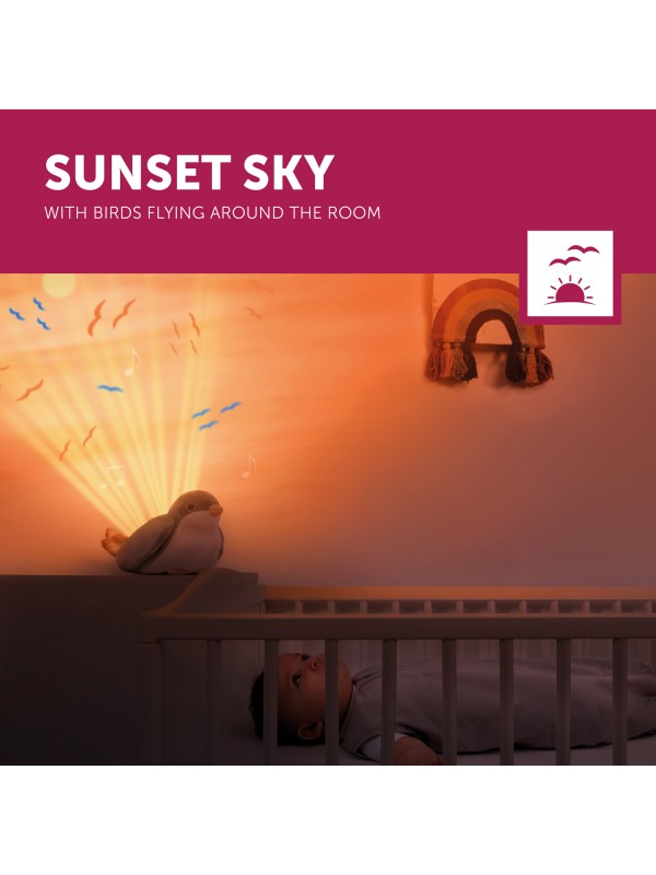 Shally de Mus van Zazu tovert de kinderkamer om tot een rustgevende zonsondergang met bewegende projecties van vogels en lucht op het plafond. De combinatie van kalmerende lichtprojecties en ontspannende geluiden helpt je kindje om op een natuurlijke manier in slaap te vallen.
