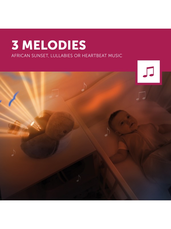De projector speelt rustgevende geluiden zoals Afrikaanse natuurgeluiden, de hartslag van een moeder en zachte slaapliedjes. Dankzij het unieke 3-stappen slaapprogramma nemen zowel de helderheid van het licht als het volume van de muziek geleidelijk af. Na 30 minuten schakelt Shally automatisch uit.