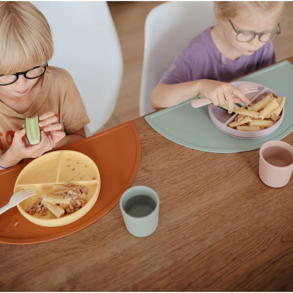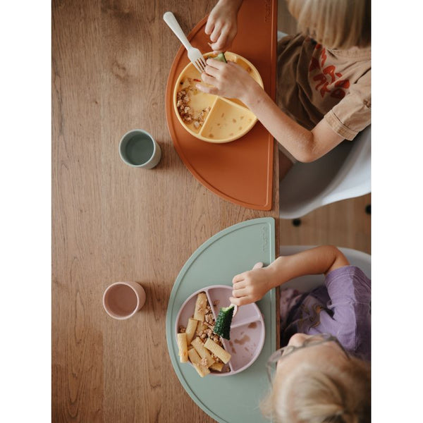 Siliconen bord van Mushie kan wel tegen een stootje, en door de handige zuignap is morsen verleden tijd