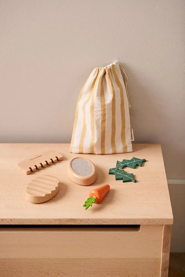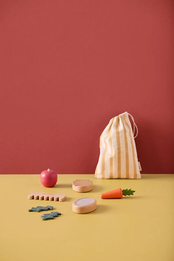 Met deze verzorgingsset van Kid's Concept beleven kinderen eindeloos plezier terwijl ze zorgen voor hun knuffels, hobbelpaarden of andere favoriete speeltjes. De set bevat twee borstels, een kam en speelgoedvoedsel zoals een wortel, appel en twee slablaadjes. Alles wordt netjes opgeborgen in een gestreepte katoenen tas, waardoor het eenvoudig mee te nemen is. Deze set stimuleert fantasierijk spel en leert kinderen spelenderwijs over zorg en verantwoordelijkheid.