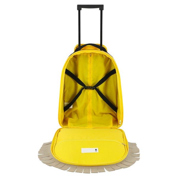 De trolley heeft een uitschuifbaar handvat en stevige wieltjes zodat ieder kind vlot zijn of haar eigen valiesje kan meenemen. In het grote zakje vooraan kan je spulletjes bewaren die je liever dichtbij de hand houdt. Binnenin vind je een naamplaatje, een apart zakje met ritssluiting en een handige rekker om alle kleertjes netjes bij elkaar te houden.