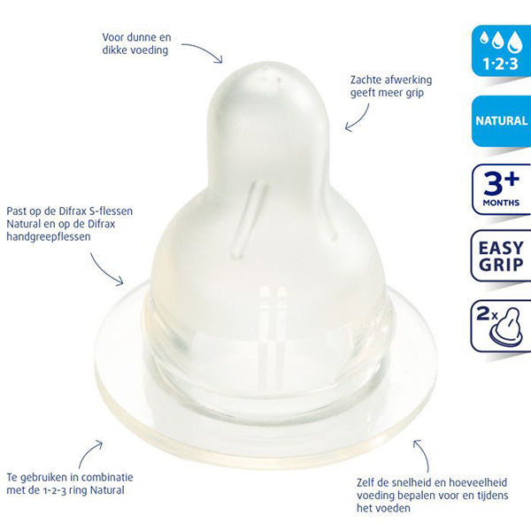 Met de Difrax 1-2-3 Doseerspeen Natural voor bij de speciale 1-2-3 ring doseer je de hoeveelheid voeding en daarmee bepaal je de stroomsnelheid van de voeding. Geschikt voor de babyfles Natural 170 ml, 240 ml en 250 ml. De 1-2-3 Doseerspeen is geschikt voor dunne en dikke voeding en te gebruiken vanaf 3 maanden. Ideaal voor wanneer je kindje melkvoeding krijgt maar ook een papfles.