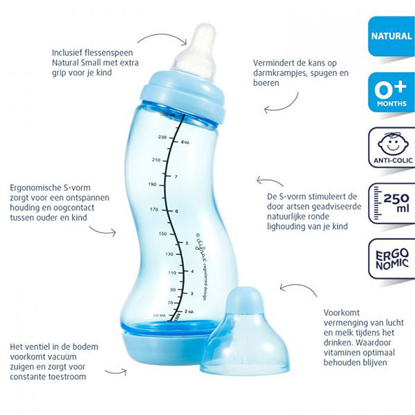 De Difrax S-fles Natural 250 ml is de populairste babyfles voor baby, papa en mama. Het speciale anti-darmkrampjes ventiel en de S-vorm zorgen voor een constante stroom van flesvoeding. De S-fles Anti-colic is vanaf de geboorte te gebruiken en ideaal in combinatie met borstvoeding.