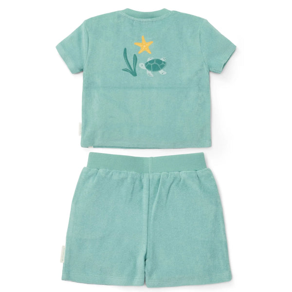 Genießen Sie sonnige Tage mit diesem bequemen T-Shirt und Shorts Set aus der Ocean Sea Life Kollektion in der Farbe Ocean Blue. Aus 100% Bio-Baumwolle in weicher Frotteequalität gefertigt, ist dieses Set ideal zum Tragen nach dem Schwimmen oder bei sommerlichen Abenteuern.
