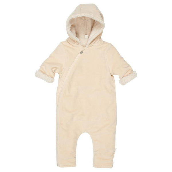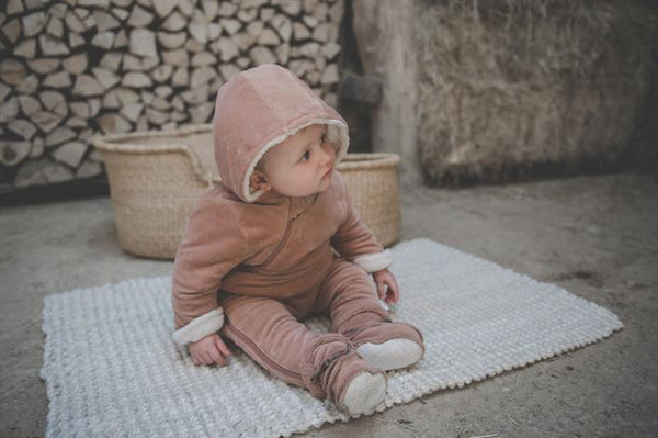 In this teddy-lined baby suit your little one will be nice and warm when you go out in the colder months. The baby suit has a hood and can be fully opened with a zipper that runs asymmetrically across the suit and has a protective tab at the top for the chin. Mix 'n match with a knitted hat and warm slippers; this way your little one will be comfortable and you will go out stylishly!
