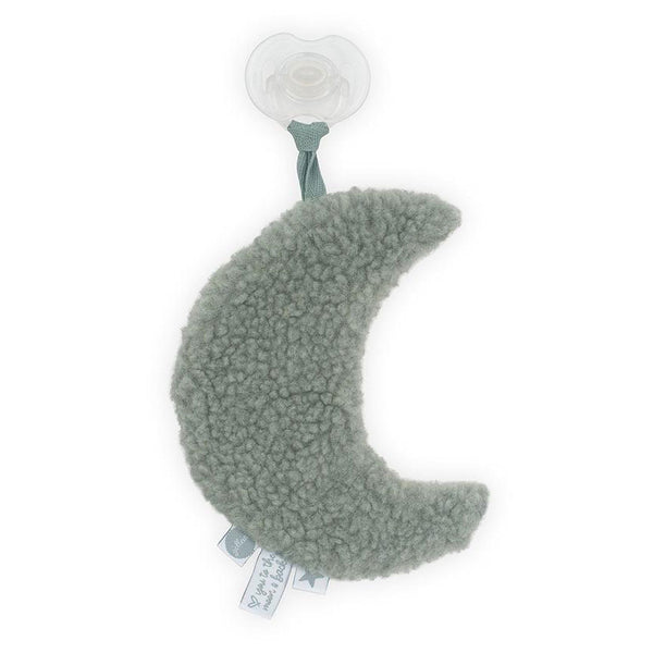 Fine teddy blanket Moon from Jollein. The blanket is available in green and pink and has a size of 16 cm. The teddy cuddly blanket is made of polyester and has a cord with which you can tie it to the pacifier.