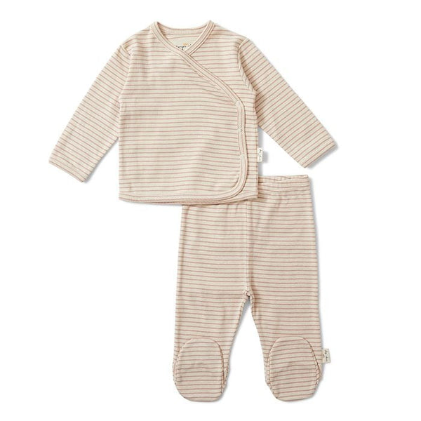 The two-piece set includes a long-sleeved overlap shirt and pants with feet attached.
