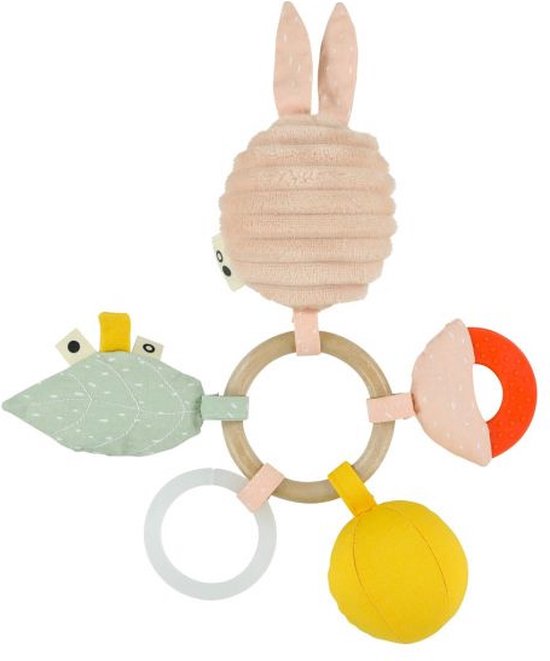 L'anneau est en plastique et quatre jouets pratiques y sont attachés. Il y a non seulement une jolie tête d'animal à câliner, mais aussi une jolie feuille, un anneau de dentition et un miroir. L'anneau blanc est parfait pour le fixer au parc, au berceau ou au Maxi Cosi. Parfait pour la maison et les déplacements ! Trixie Baby colore votre monde en créant les plus jolis accessoires pour bébés aux motifs joyeux et colorés.