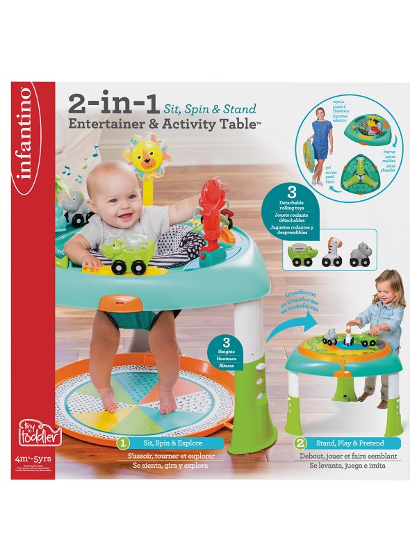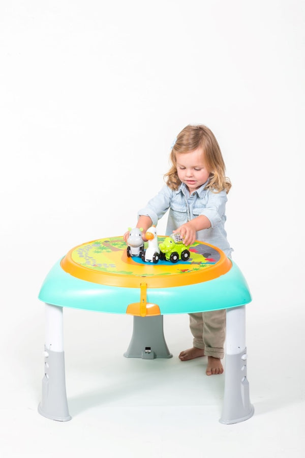 Les 3 véhicules sont détachables. Bébé peut jouer avec eux séparément lorsqu'il grandit. Tous les jeux sont pliables. La table d'éveil devient une table avec plateau. Les pieds sont réglables en hauteur : H 39 / H 42 / H 46 cm. Le plateau a un diamètre de 56 cm. Sous le plateau, il y a 2 décors au choix pour inventer des histoires. Les décors sont lavables avec un simple chiffon humide. Les pieds de la table sont pliables. La table est facile à transporter. "