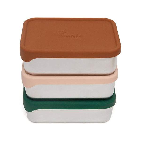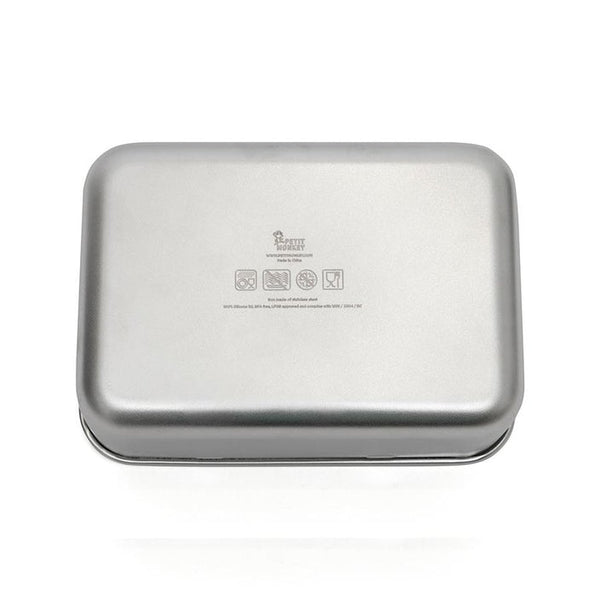 Boîte à lunch Petit Monkey en acier inoxydable avec couvercle en silicone. La boîte à lunch en acier inoxydable peut contenir 4 sandwiches. Le couvercle en silicone est facile à ouvrir et à fermer.