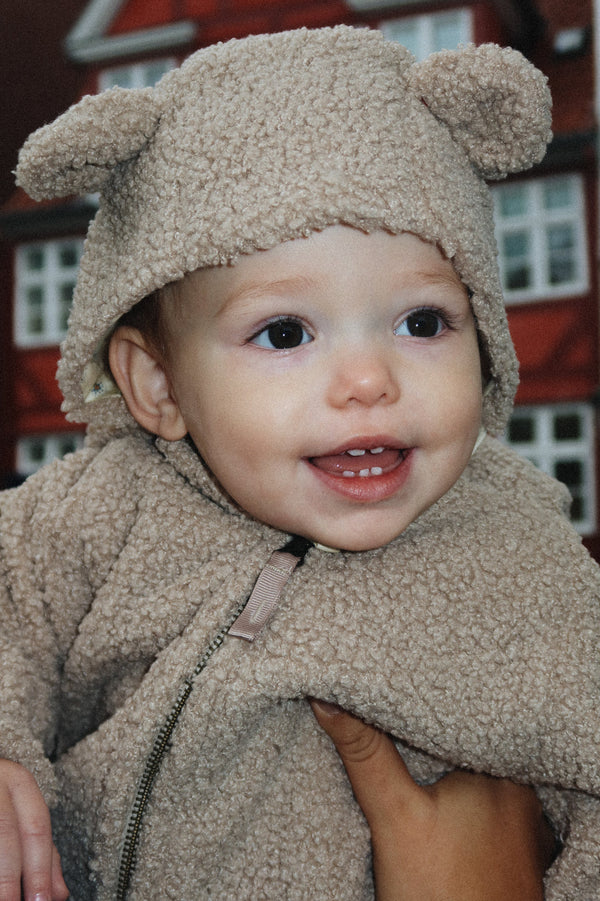 Le bonnet grizz est fait d'un doux tissu nounours à l'extérieur et d'un joyeux imprimé animalier à l'intérieur. Vous pouvez attacher fermement le chapeau avec des ficelles au bas de la tête de votre enfant. Le chapeau reste ainsi bien en place !